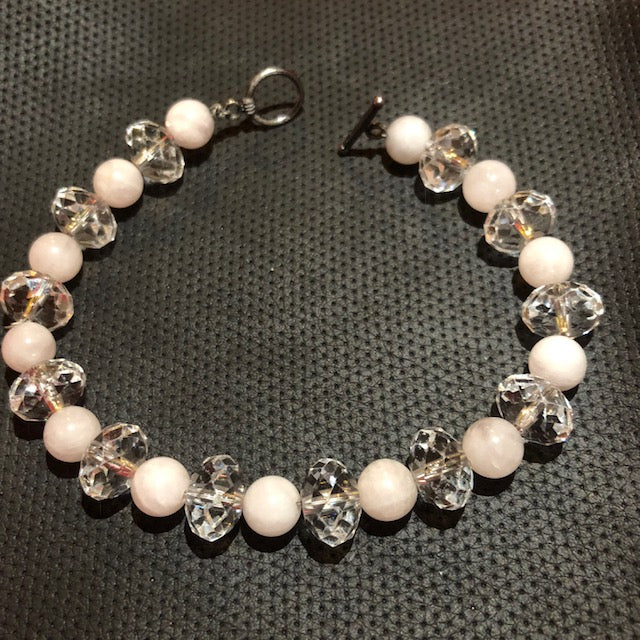 This bracelet is made with rose quartz and crystal. Rose Quartz is a love stone and is known to be used with energy work involving love. This stone is associated with the heart chakra and can be used to alleviate problems in the heart area. Rose quartz can help to attract love, lovers, and strengthen existing love bonds. Clear crystal is great for directing energy and manifestation. closely associated with the color of pure light, quartz can be used for cleansing, clearing and drawing energy. This is a good bracelet for Pisces or any love sign.